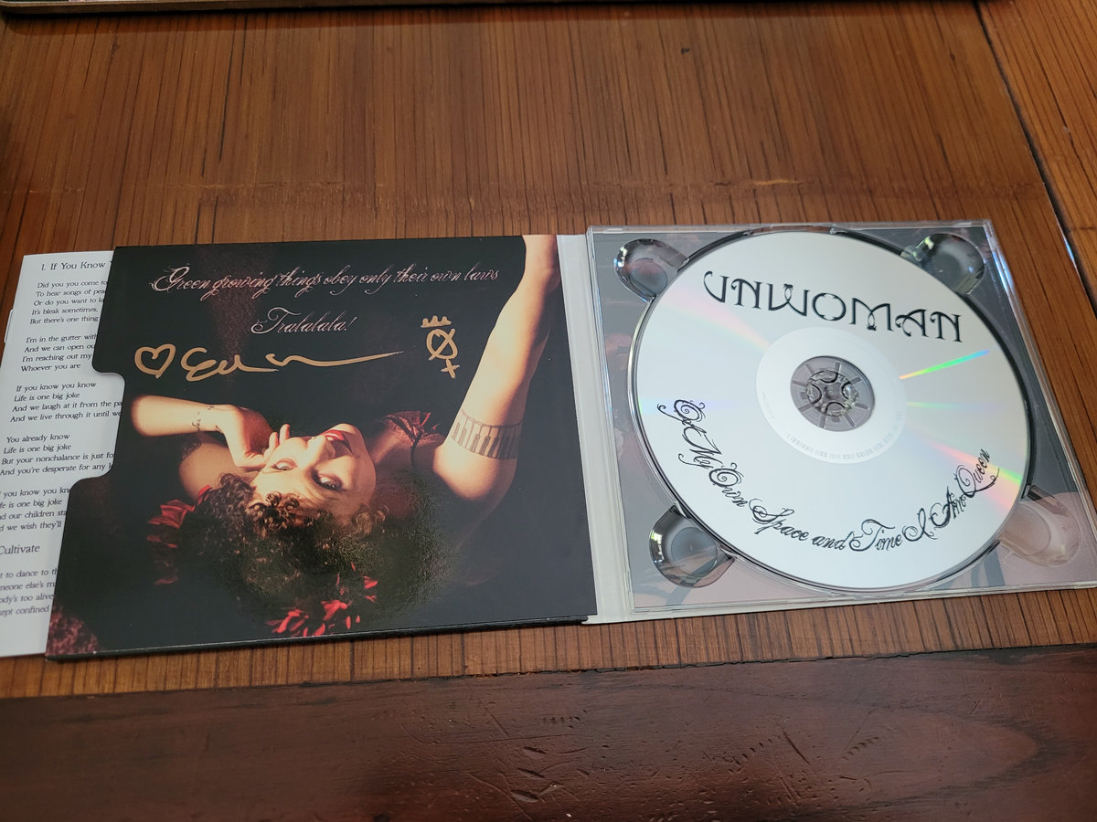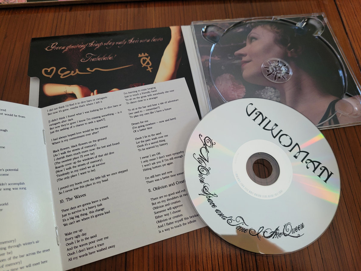 A poster with the same photo as the cover of Of My Own Space and Time I Am Queen, but taller and less glossy than the digipack. Thin paper but good print quality. Can be signed by Unwoman or not.